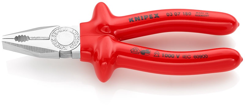 Плоскогубцы комб. VDE, рез: провол. ср. d 3.4 мм, твёрд. d 2.2 мм, кабель d 12 мм (16 мм²), L-180 мм, хром, 2-к ручки, держатель